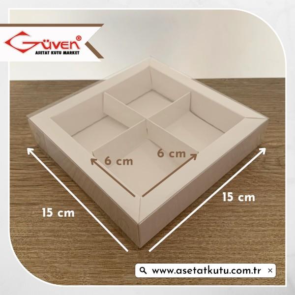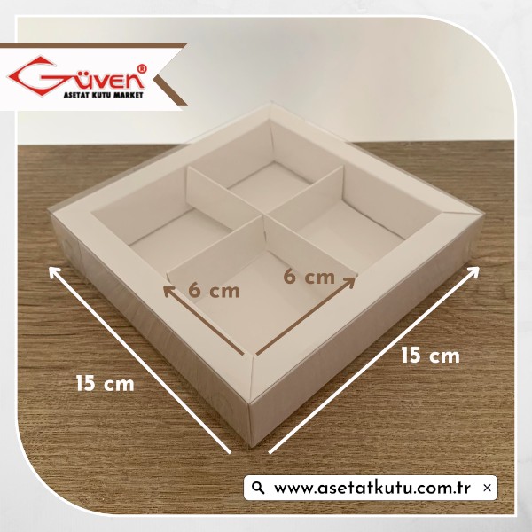 [4 Bölmeli, Duvarlı] 15x15x3 Altı Beyaz Karton Üstü Asetat Kutu