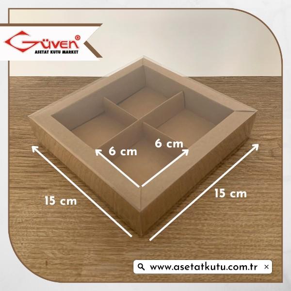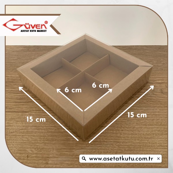 [4 Bölmeli, Duvarlı] 15x15x3 Altı Kraft Karton Üstü Asetat Kutu