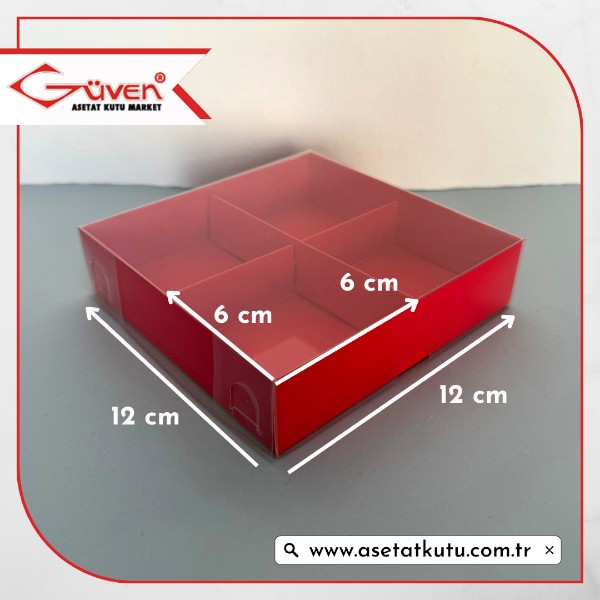 [4 Bölmeli] 12x12x3 Altı Kırmızı Karton Üstü Asetat Kutu