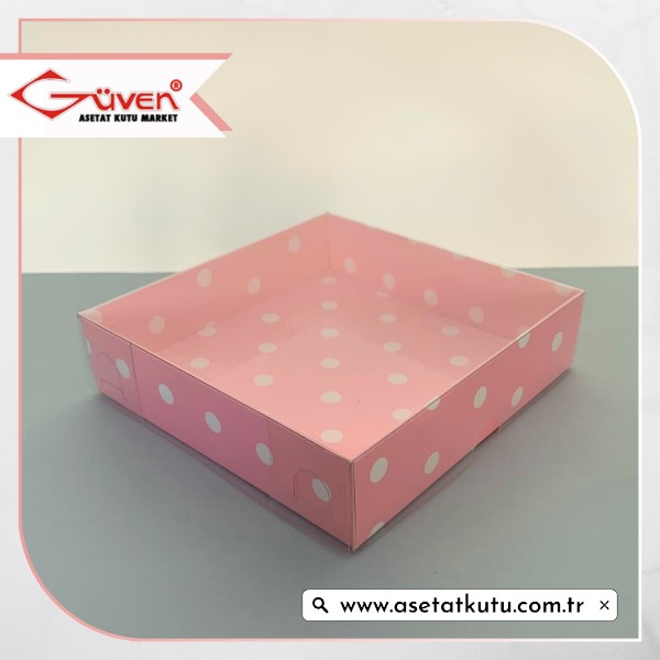 12x12x3 Altı Pembe Zemin Beyaz Puantiyeli Karton Üstü Asetat Kutu