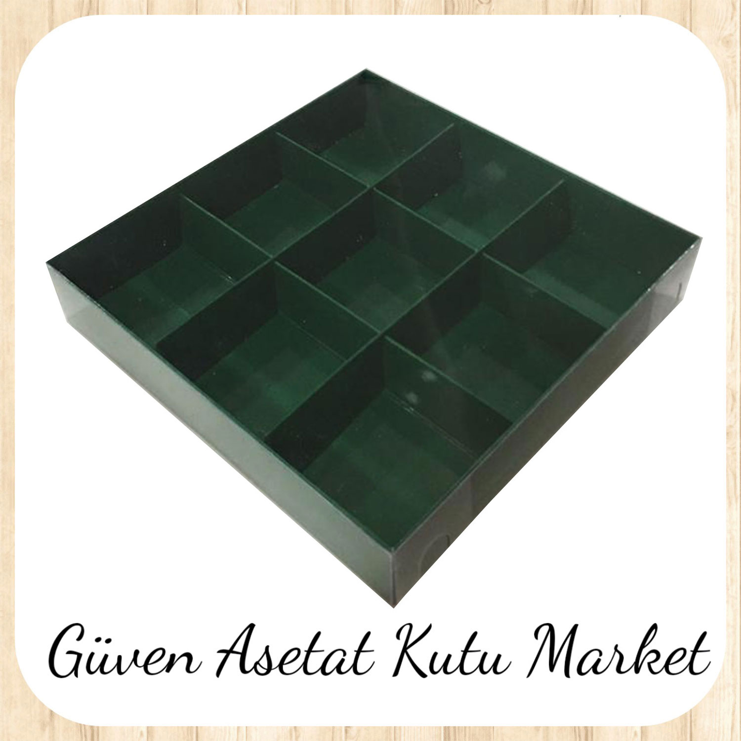 [9 Bölmeli] 15x15x3 Altı Yeşil Karton Üstü Asetat Kutu