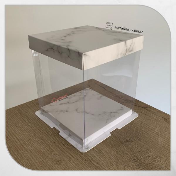 17x17x20 Beyaz Mermer Desenli Karton ve Asetat Kutu (HM41)