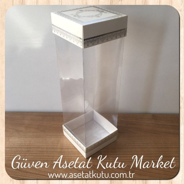 8x8x25 Asetat, Çift Taraflı Beyaz Üzerine Gümüş Kilim Desenli Kutu